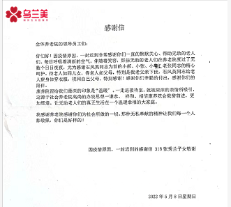 隨著錦旗一起送進(jìn)來(lái)的還有一封致謝烏蘭美康養(yǎng)院全體工作人員的感謝信,來(lái)信人是在康養(yǎng)院入住的張秀蘭奶奶的子女,他們?cè)谛胖懈兄x工作人員對(duì)張奶奶的悉心呵護(hù)、專業(yè)照顧、辛勤付出和陪伴,更稱贊康養(yǎng)院為所有的老人提供了一個(gè)幸福溫暖的大家庭,最后祝愿康養(yǎng)院的明天更加輝煌。